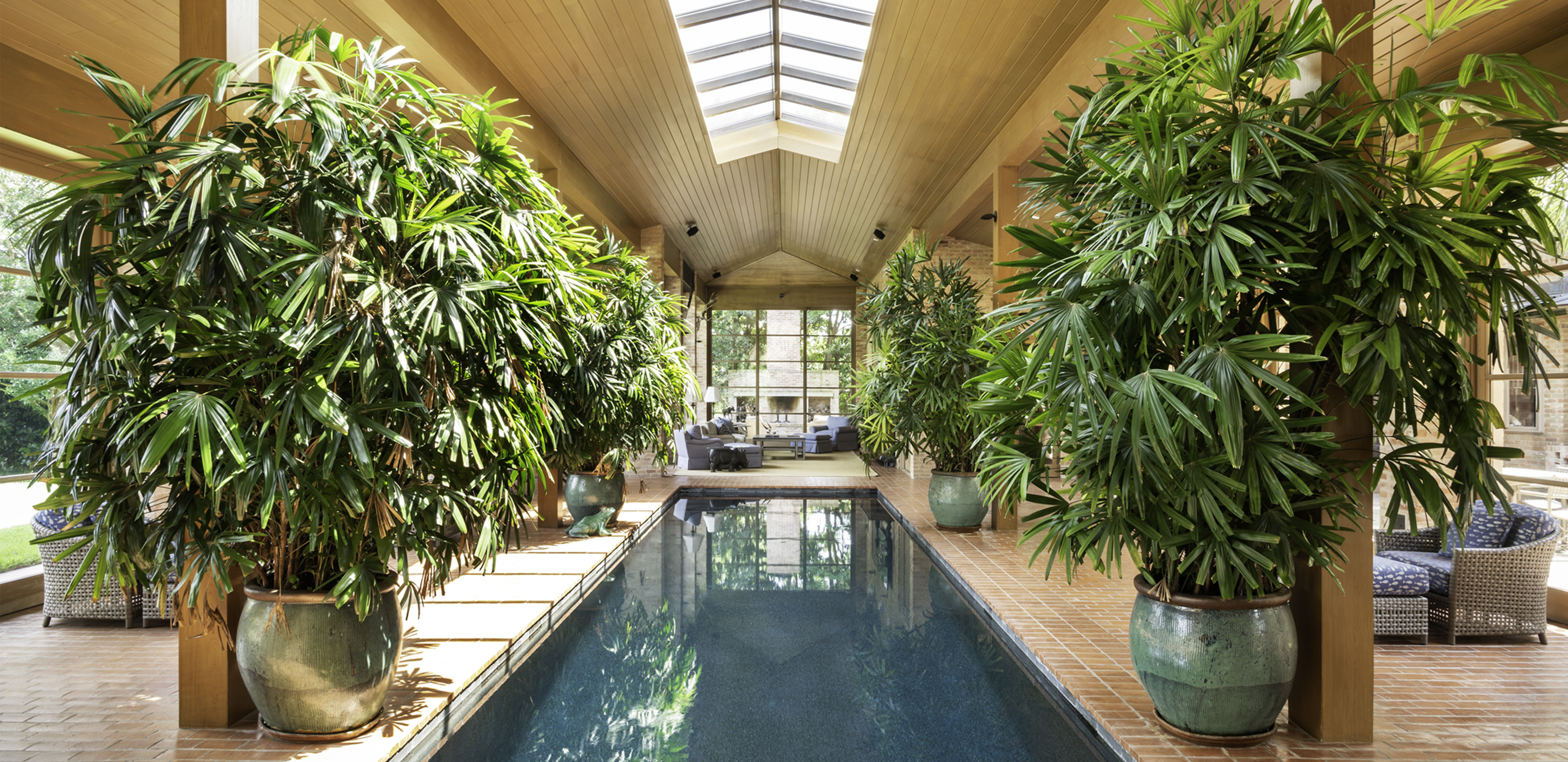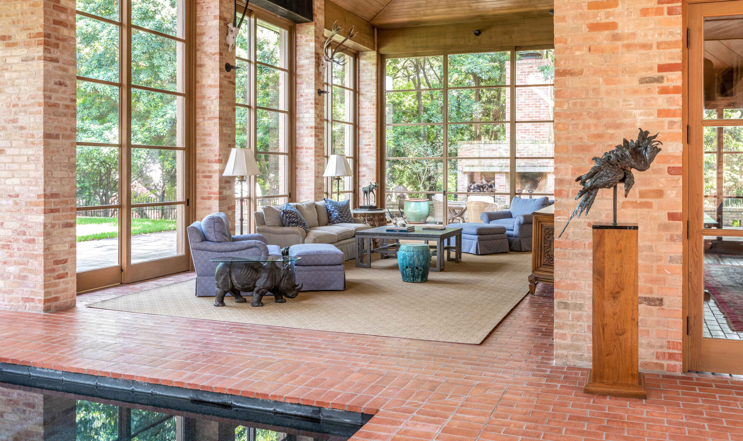 The natatorium addition, constructed of custom Mexican brick walls and tide water cypress doors respond to the adjacent 1938 O’Neil Ford House.