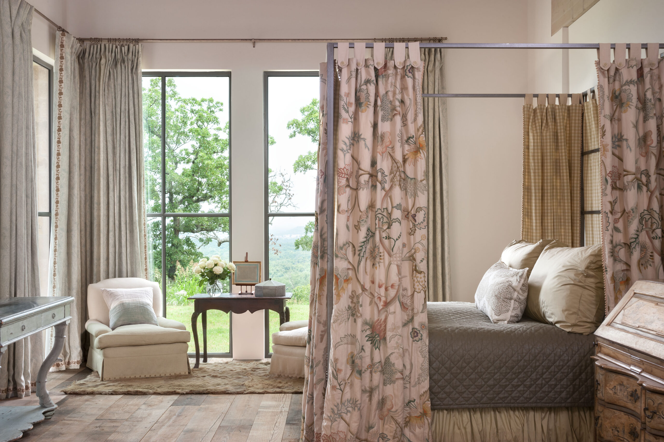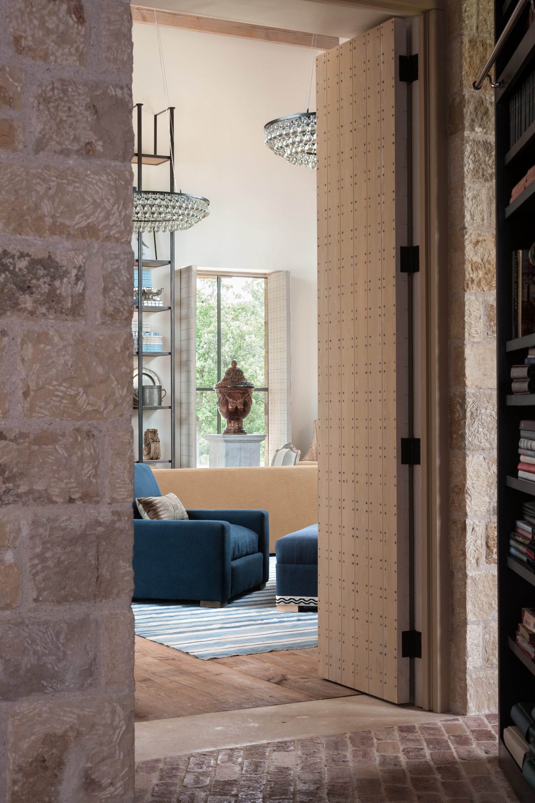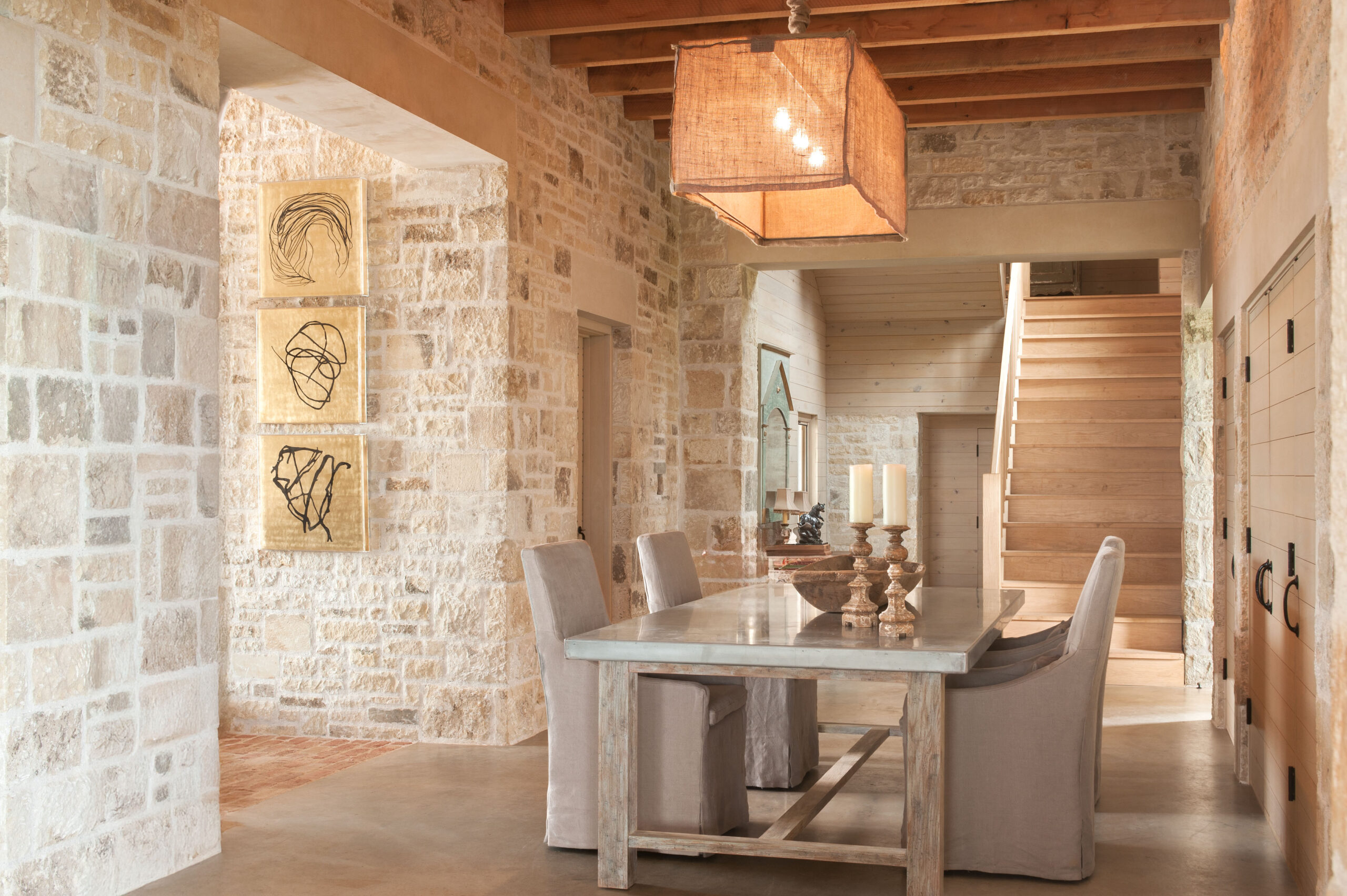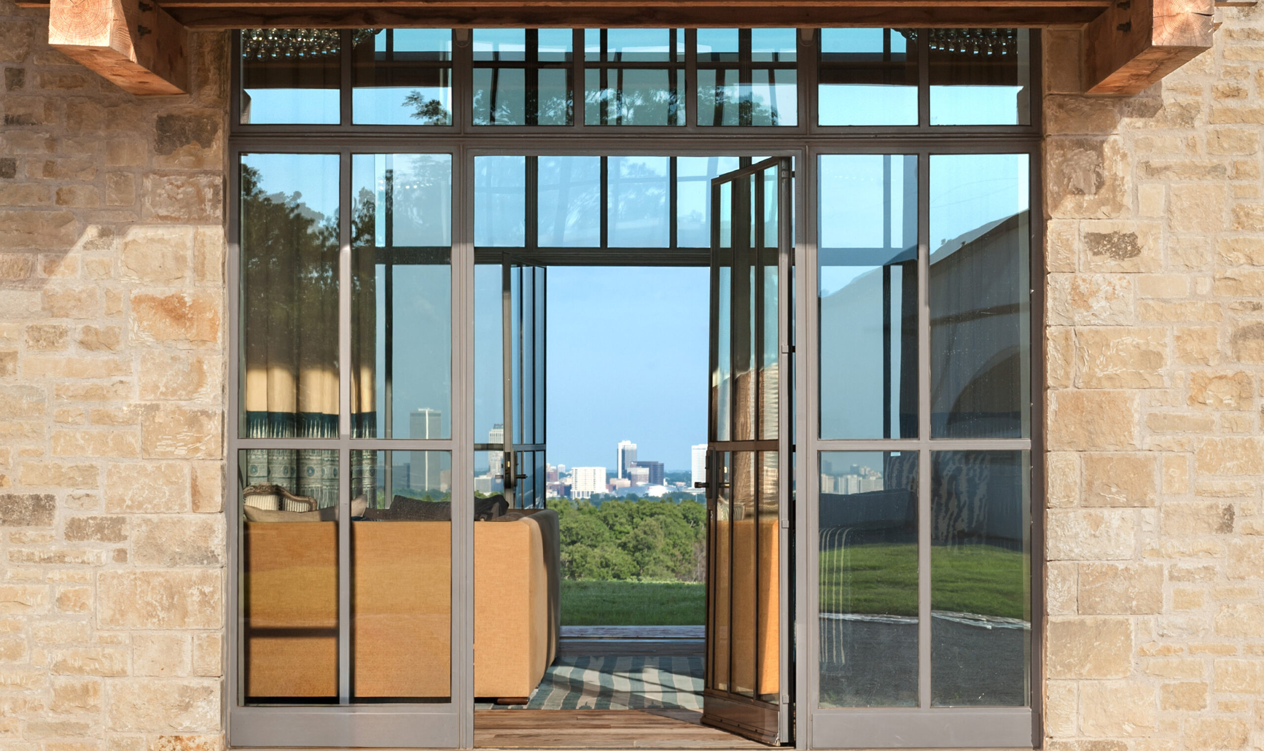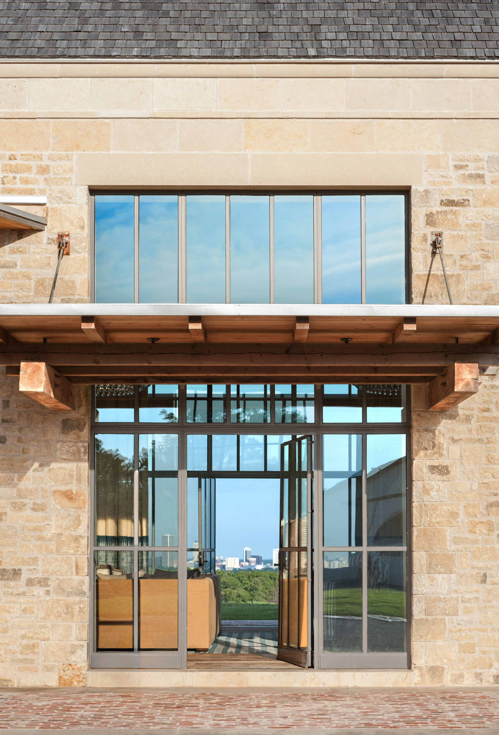 The Tulsa Ranch house sits on a hilltop and includes four stone buildings connected by glass breezeways. The layout centers around an internal motor court and a stable court. Its outward facing design highlights views of the pastures and the city, while its simple structure quietly complements the 1930s city below.
